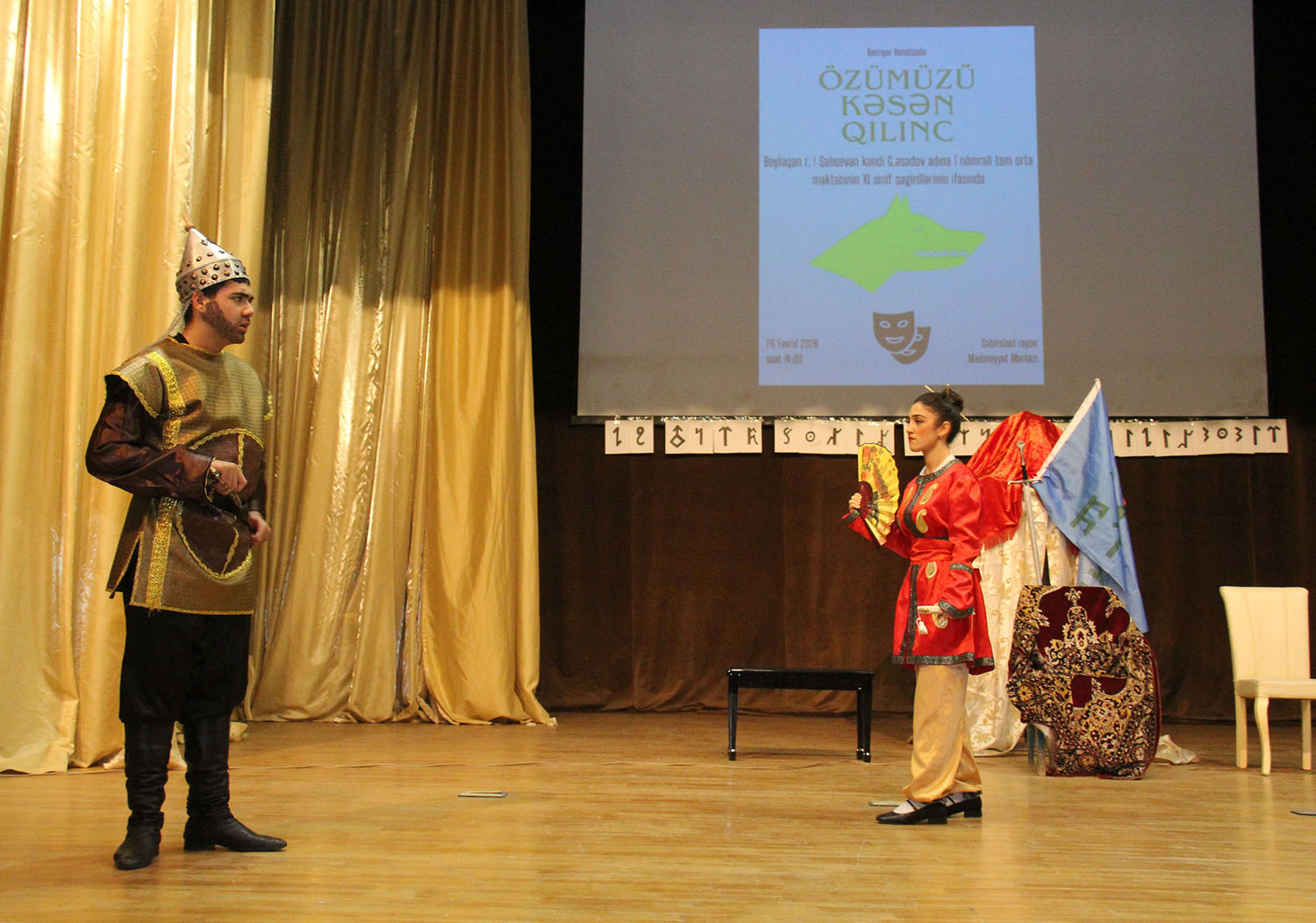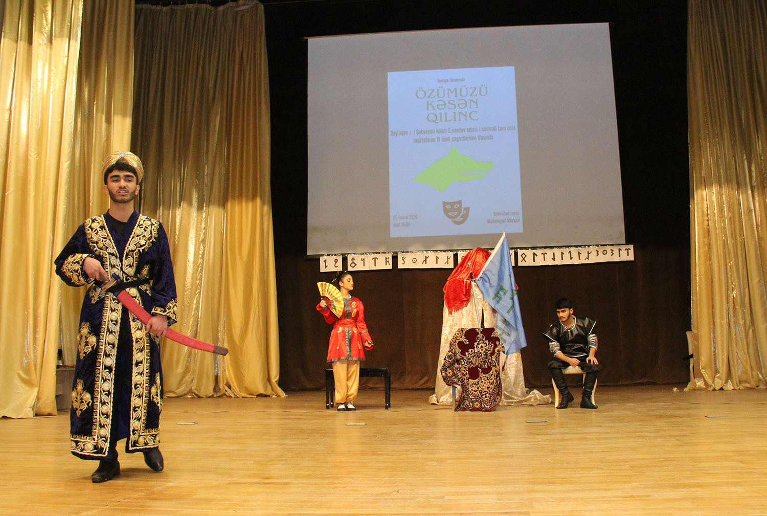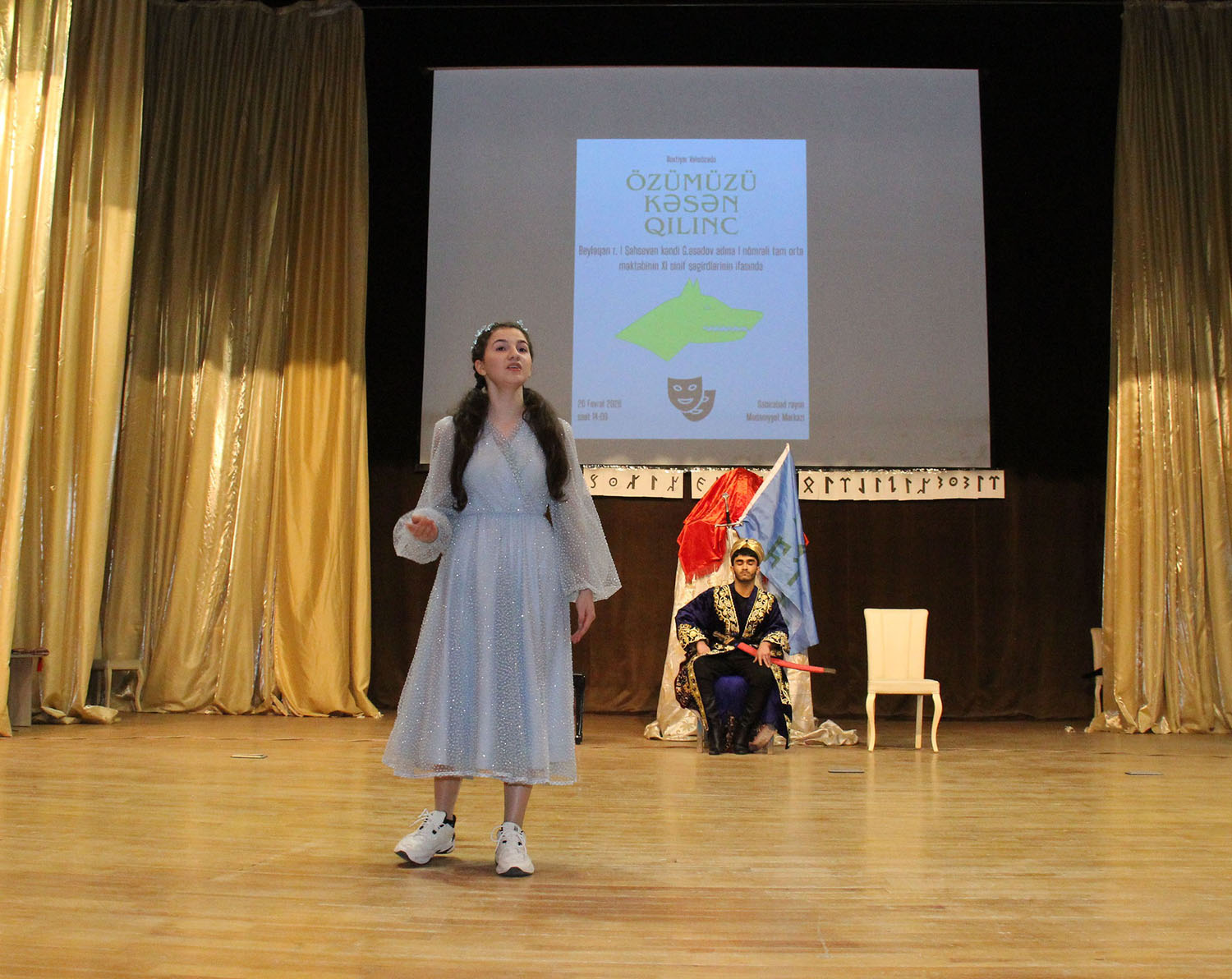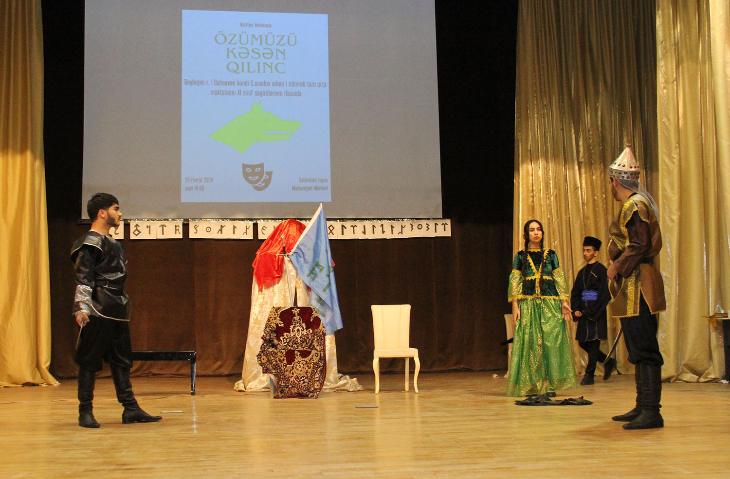 Səhnə əsəri Beyləqan rayonu Birinci Şahsevən kəndi Gəray Əsədov adına 1 nömrəli tam orta ümumtəhsil məktəbinin IX–XI sinif şagirdlərinin ifasında nümayiş olunub. Gənc aktyorların böyük məsuliyyət və həvəslə çıxış etməsi tamaşaya xüsusi canlılıq qatıb. Onların ifasında “Özümüzü kəsən qılınc” sadəcə bir ədəbi nümunə kimi deyil, tarixdən gələn bir dərs, bu günə ünvanlanan bir çağırış kimi səslənib.